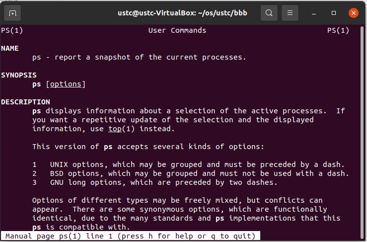 举例:man ps 可以显示ps指令的使用方法。指令输出如下图。按q退出手册。
